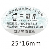 ★電碼防偽標簽簡介:刮開標簽上的涂層,獲得12-23位的防偽碼,通過撥打電話、發(fā)送短信、網站查詢,根據(jù)查詢提示,輸入防偽碼,防偽碼為真---提示正品廠家的具體信息;防偽碼為假--提示防偽碼不存在,謹防假冒;重復查詢--提示已被查詢過,并提示查詢次數(shù)和首次查詢時間。