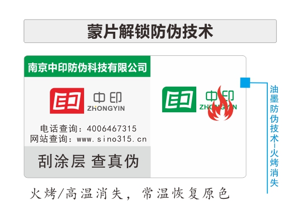 火烤消失/溫變防偽技術(shù),油墨防偽技術(shù)的一種,是利用特殊油墨的性能,高溫或火烤,文案消失,溫度降到常溫,文案又恢復(fù)到原來的顏色。